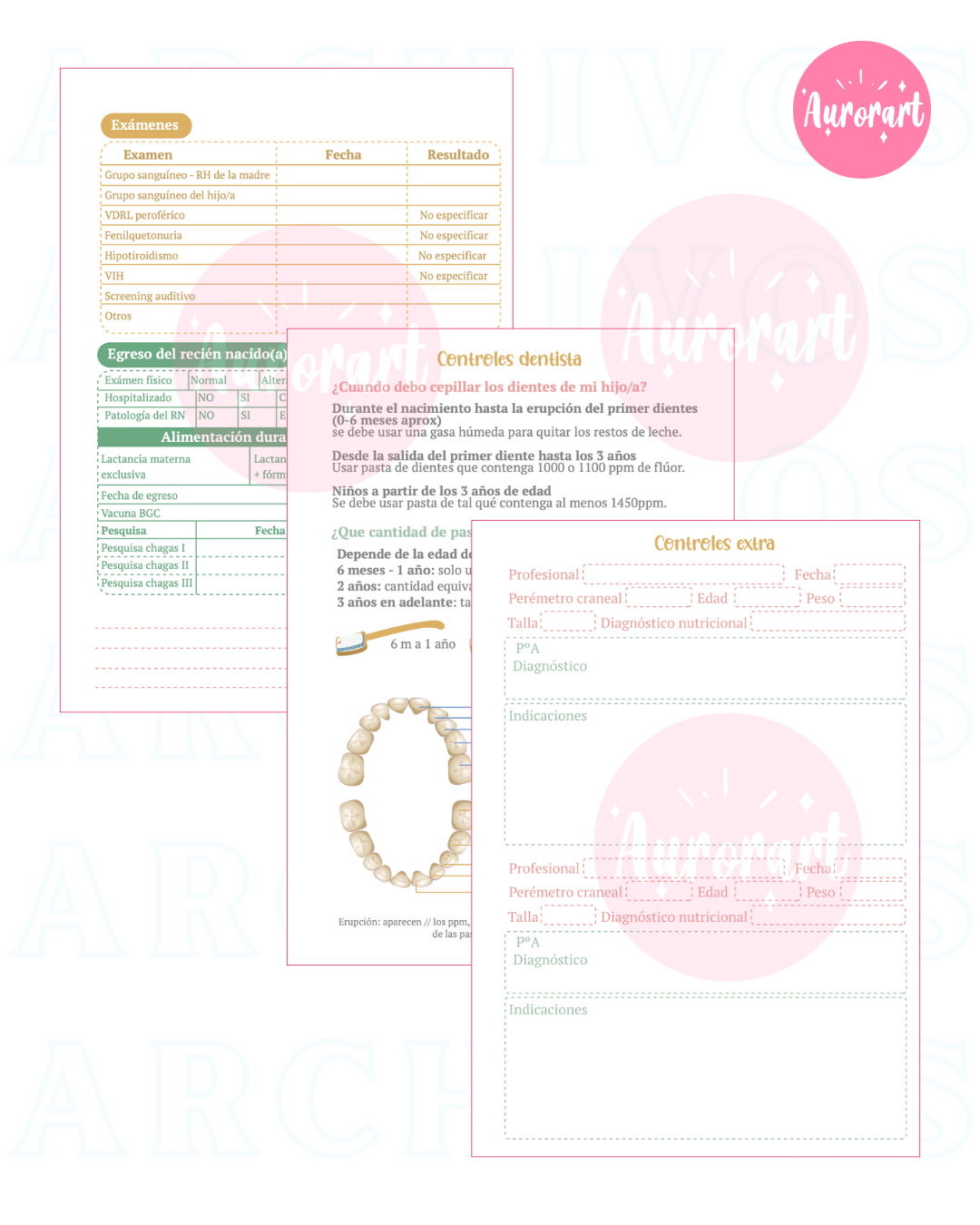 - Datos, exámenes, vacunas, controles, estimulación, dentista, contactos, tablas de crecimiento, alimentación complementaria, sección para registras tiendas de instagram.
